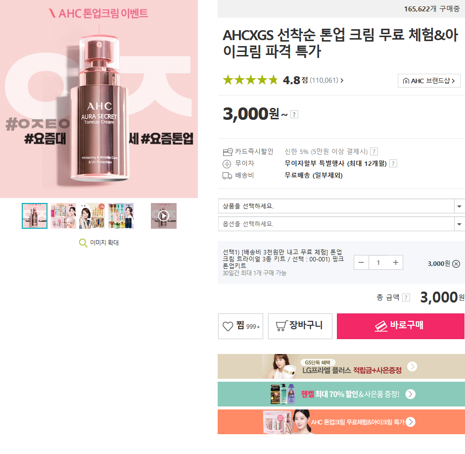 [GSSHOP] AHC 톤업 크림 무료 체험 (3,000원/무료) > 국내핫딜