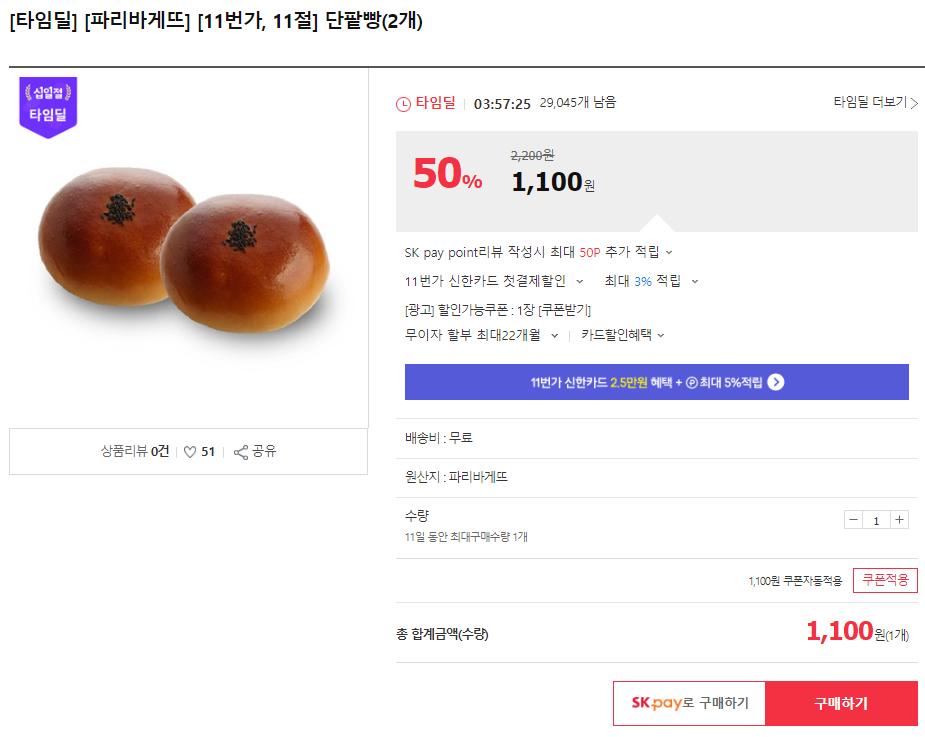 [11번가] 파리바게트 단팥빵 1+1 (1,100원) > 국내핫딜