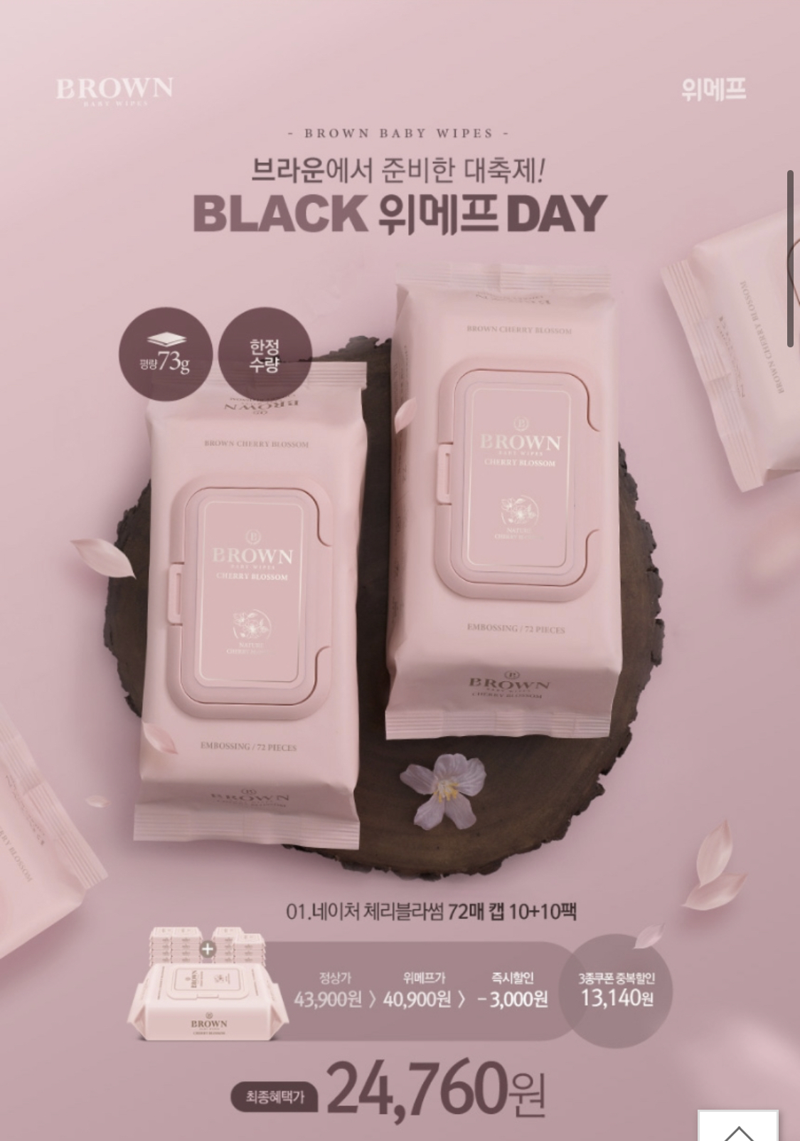 [위메프 ] 브라운 프리미엄 체리블라썸 물티슈 10팩(12,870원/무료배송) > 국내핫딜