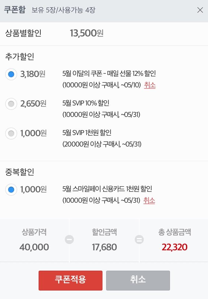 밑의 두 쿠폰 사용하시면 22,320원 나옵니다