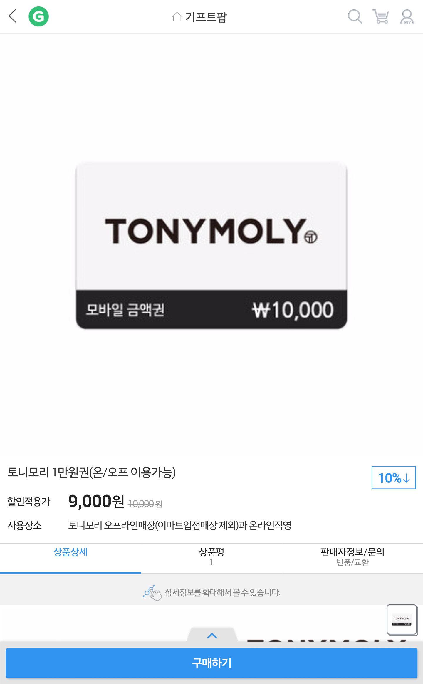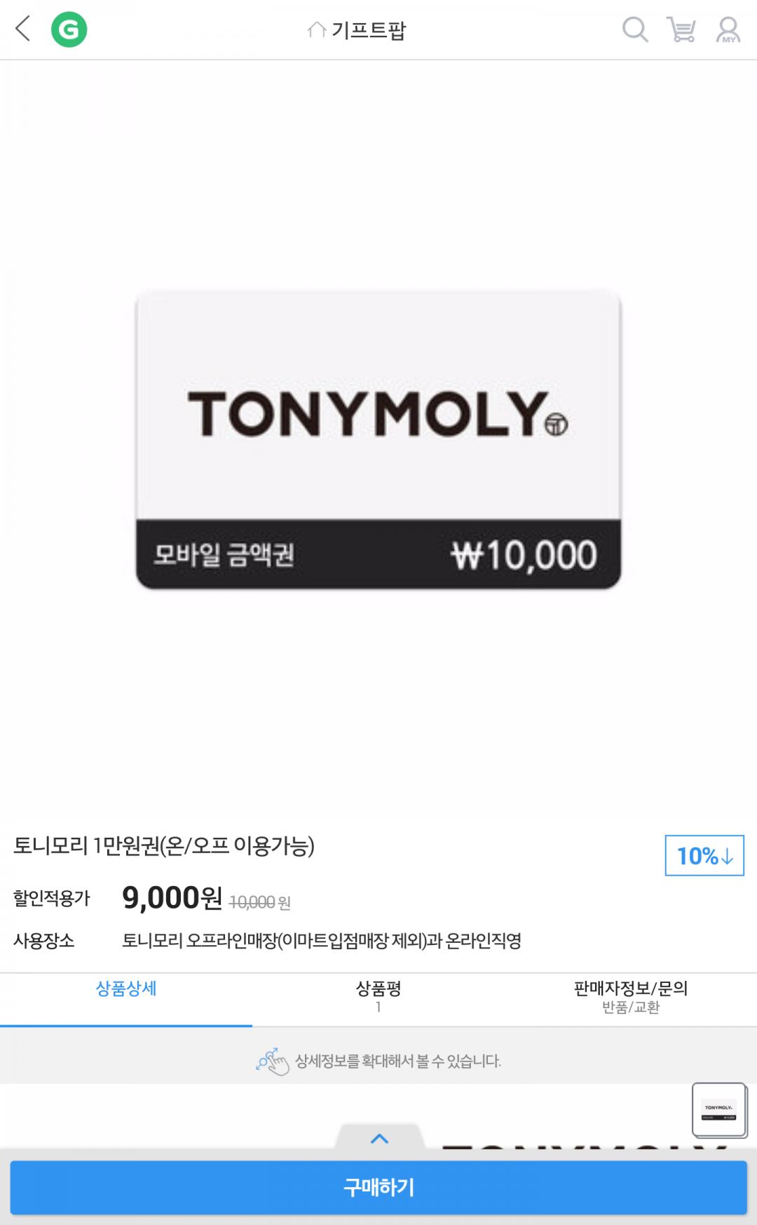 [G마켓] 토니모리 1만원권(온/오프 이용가능) (9,000/무료) > 국내핫딜