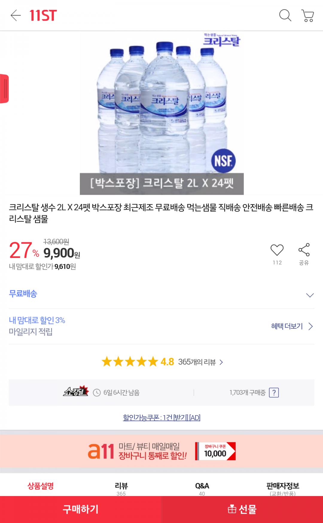 [11번가] 크리스탈생수 2L*24 (9,900/무료) > 국내핫딜