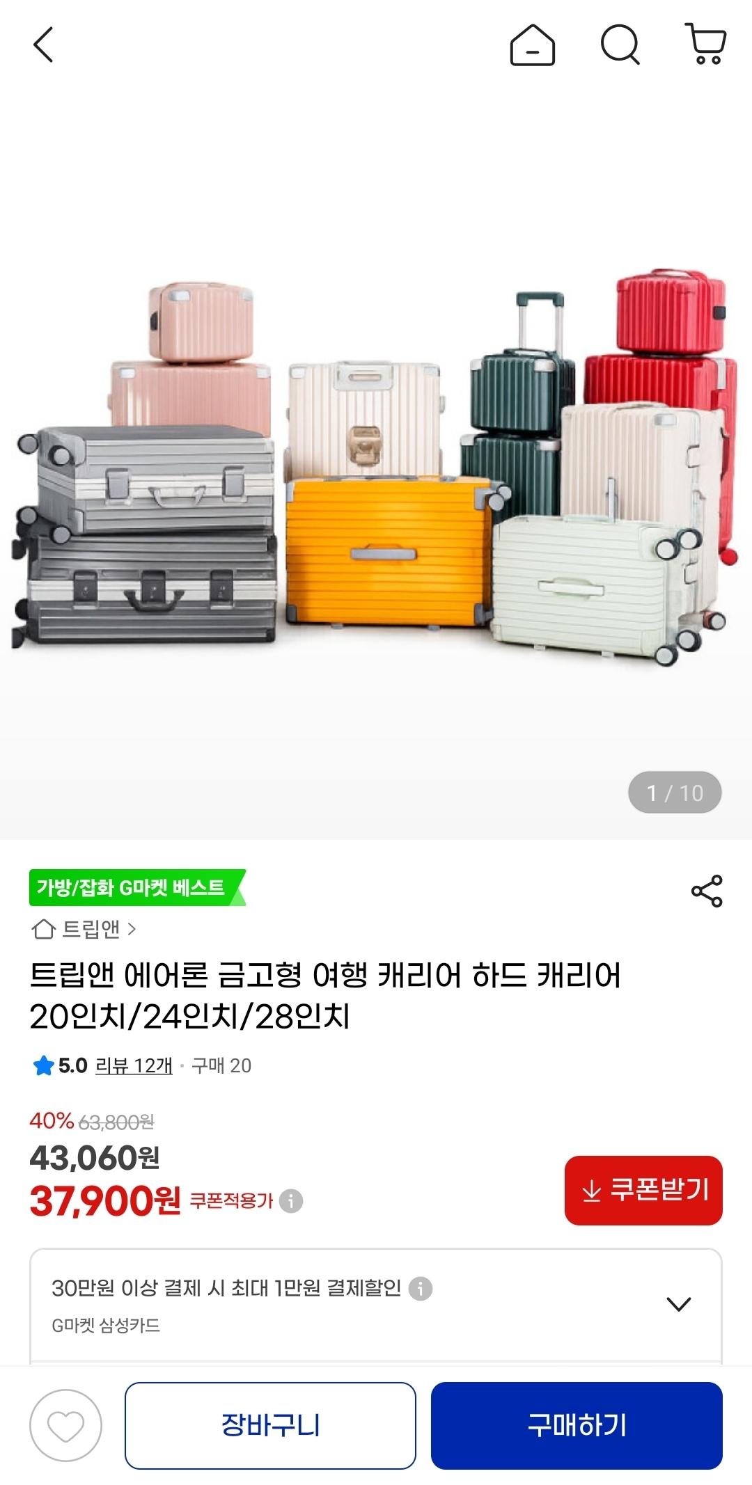 [G마켓] 트립앤 에어론 금고형 하드 캐리어 20인치/24인치/28인치 (37,900원/무배)