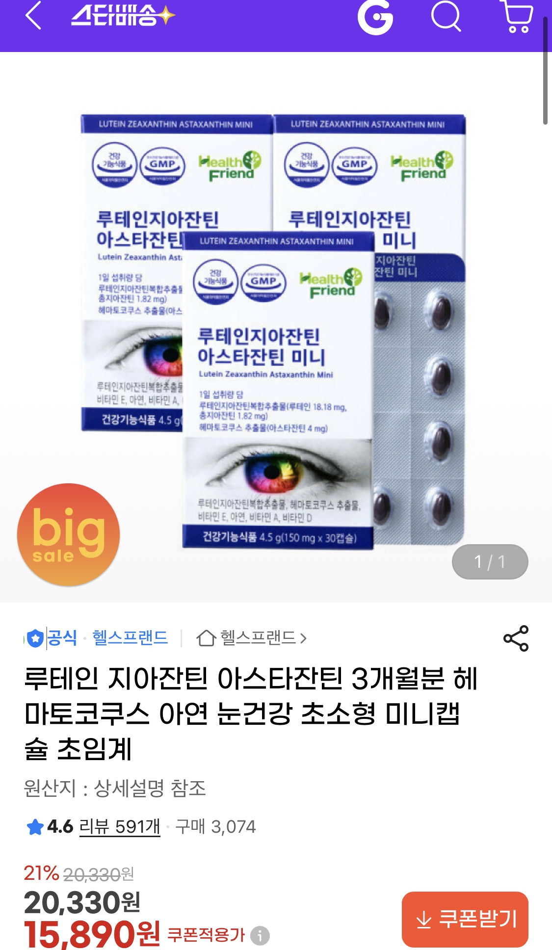 [지마켓] 눈영양제 루테인+지아잔틴+아스타잔틴 미니캡슐 3개월분 (15,890원/무배)