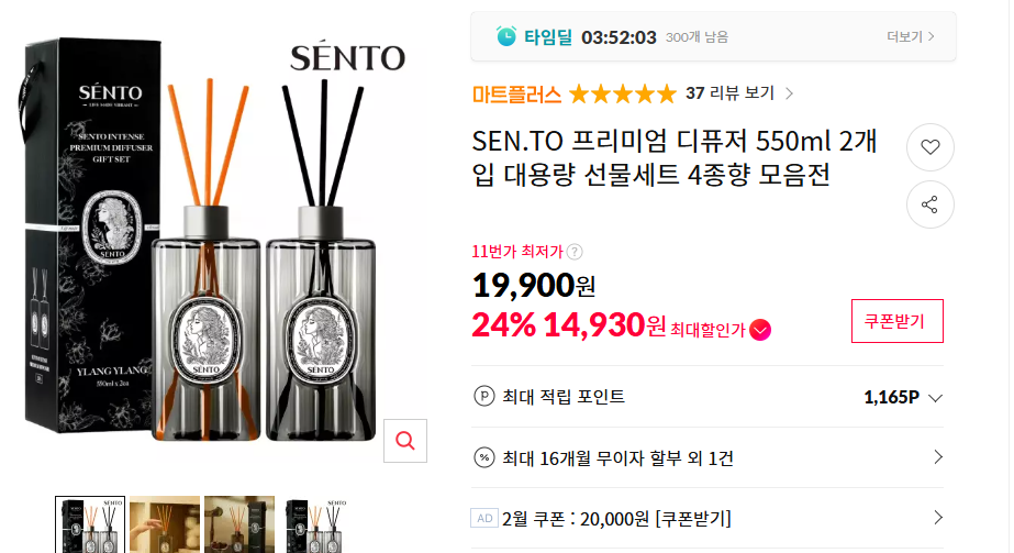 [11번가] 센토 대용량 디퓨저 2개 + 핸드워시 510ml 1개 증정(14,930원/무료)
