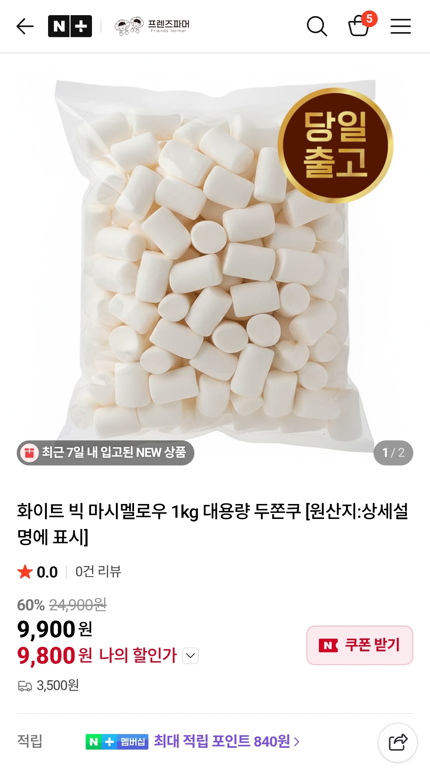 [네이버] 화이트 빅 마시멜로우 1KG 대용량 두쫀쿠 (9,800원/유배)