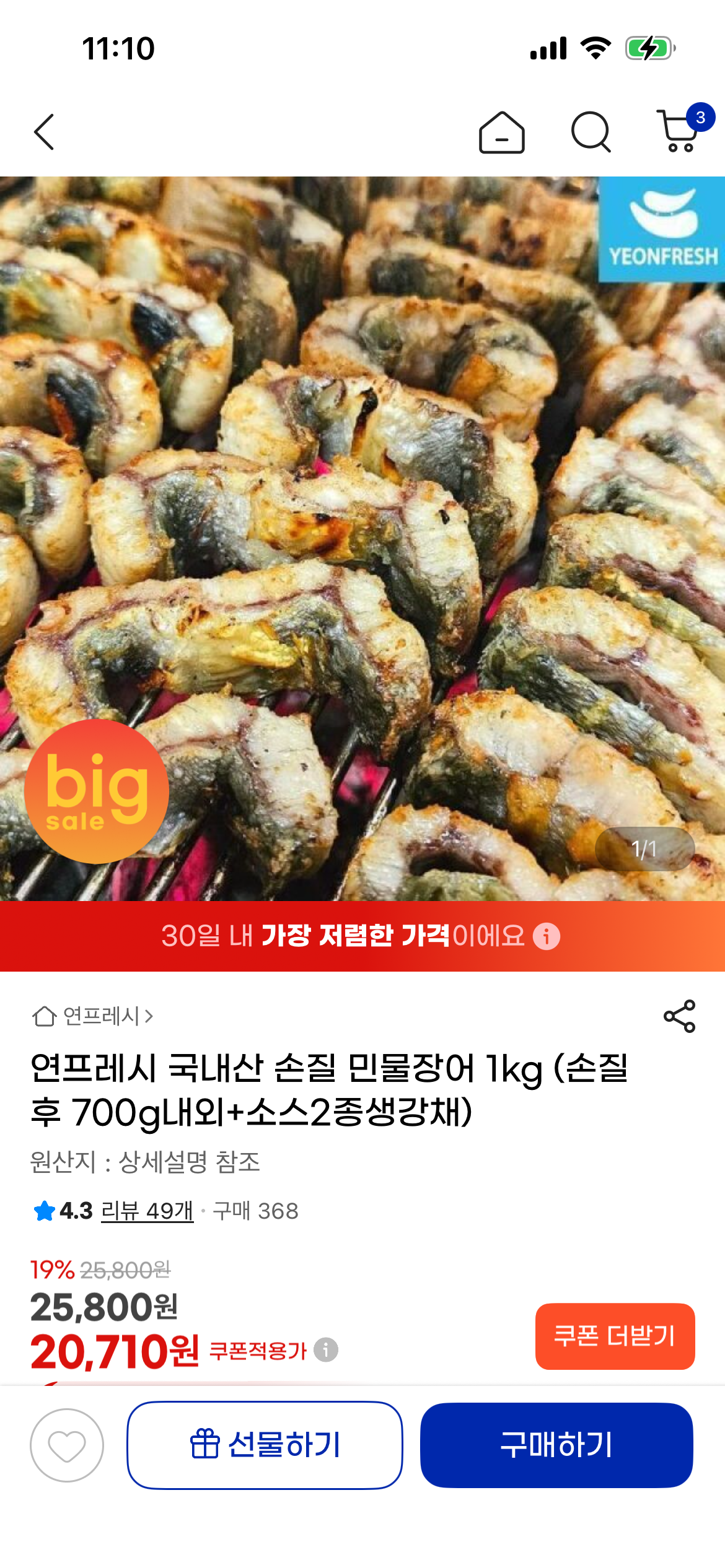 [지마켓] 국내산 손질 민물장어 1kg (손질 후 700g내외+소스2종생강채) (20,710원/무료)