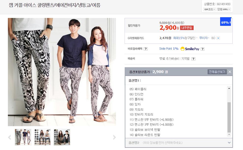 [G마켓] 잼 커플 아이스 쿨링팬츠 에어컨바지(2,900/무료)