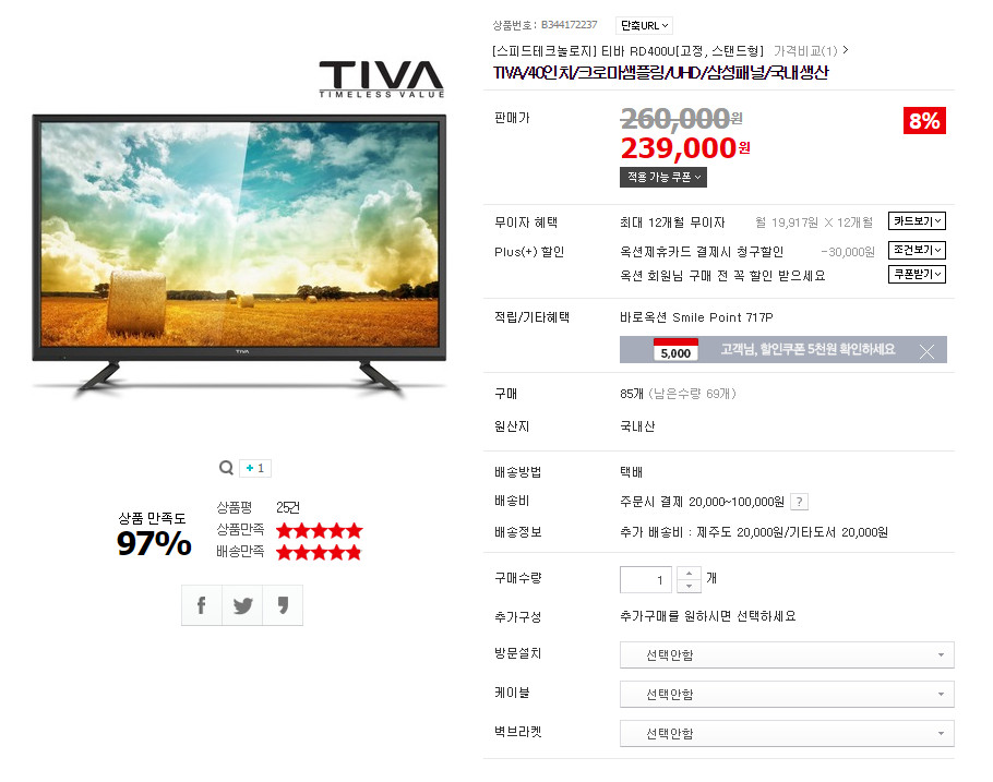 3년전에 80대정도 구입하고 숙박업소에서 사용중입니다 32인치고요 리모컨호환문제때문에 모두 티바꺼만샀고요 현재 아주잘사용하고있고요 에이에스건은 3건정도로 기억하는데 오래걸리는점을 재외하곤 문제없었습니다 |