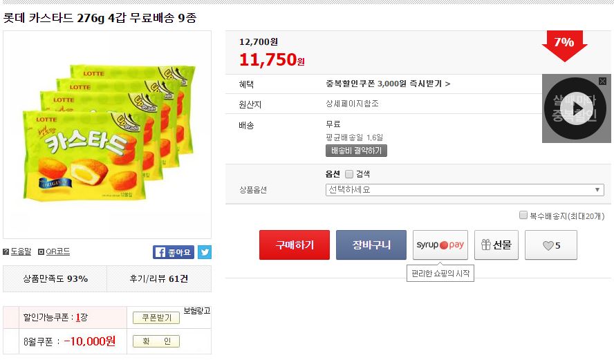 안되시면 네이버에서 롯데 카스타드(276g*4갑) 를 검색하면 11번가 11,750원 뜹니다.