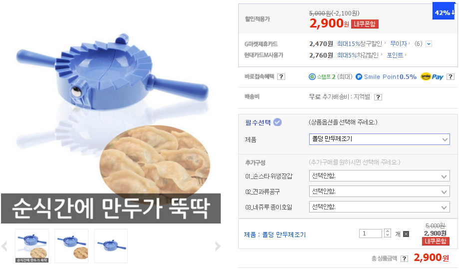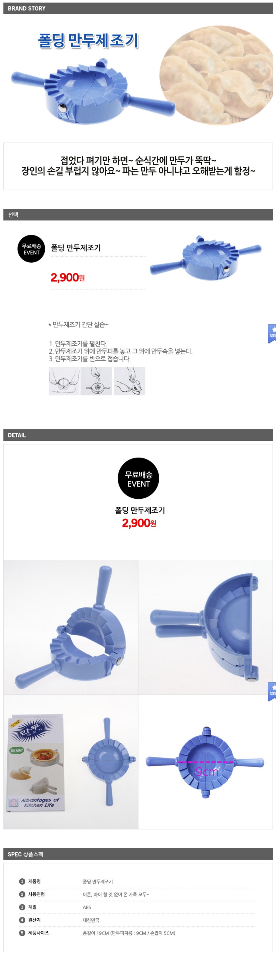 저 어렸을때부터 이런류의 만두피 접는거 있었는데 결론은 이걸로 만두를 만들면 다 터집니다. 피끼리 붙어야 되는데 안붙어서 물또는 계란 묻히고 저기안에 들어가는 만도소가 조금만 많아도 에러작렬 결정적으로 만든후 삻으면 10개중 8개는 다 터져서 나옵니다. |