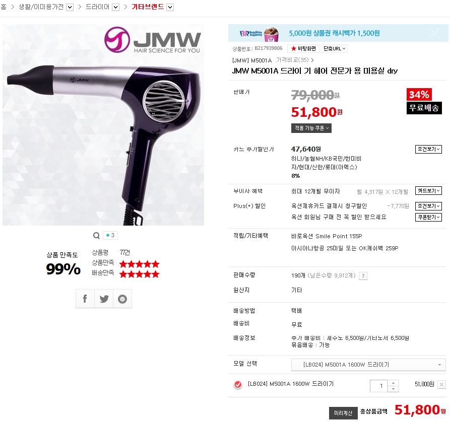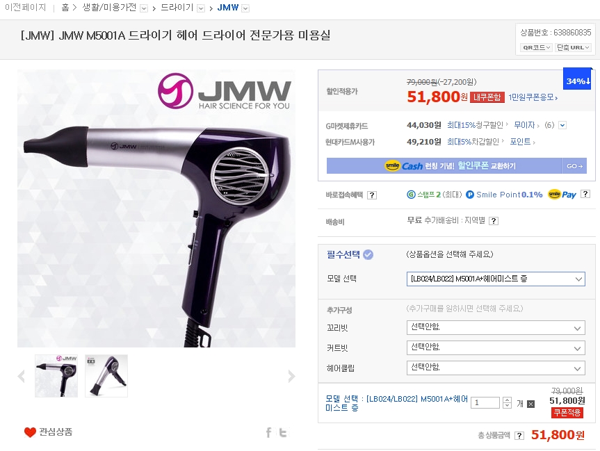 [옥션][지마켓] JMW M5001A 드라이기 (51,800/무료)