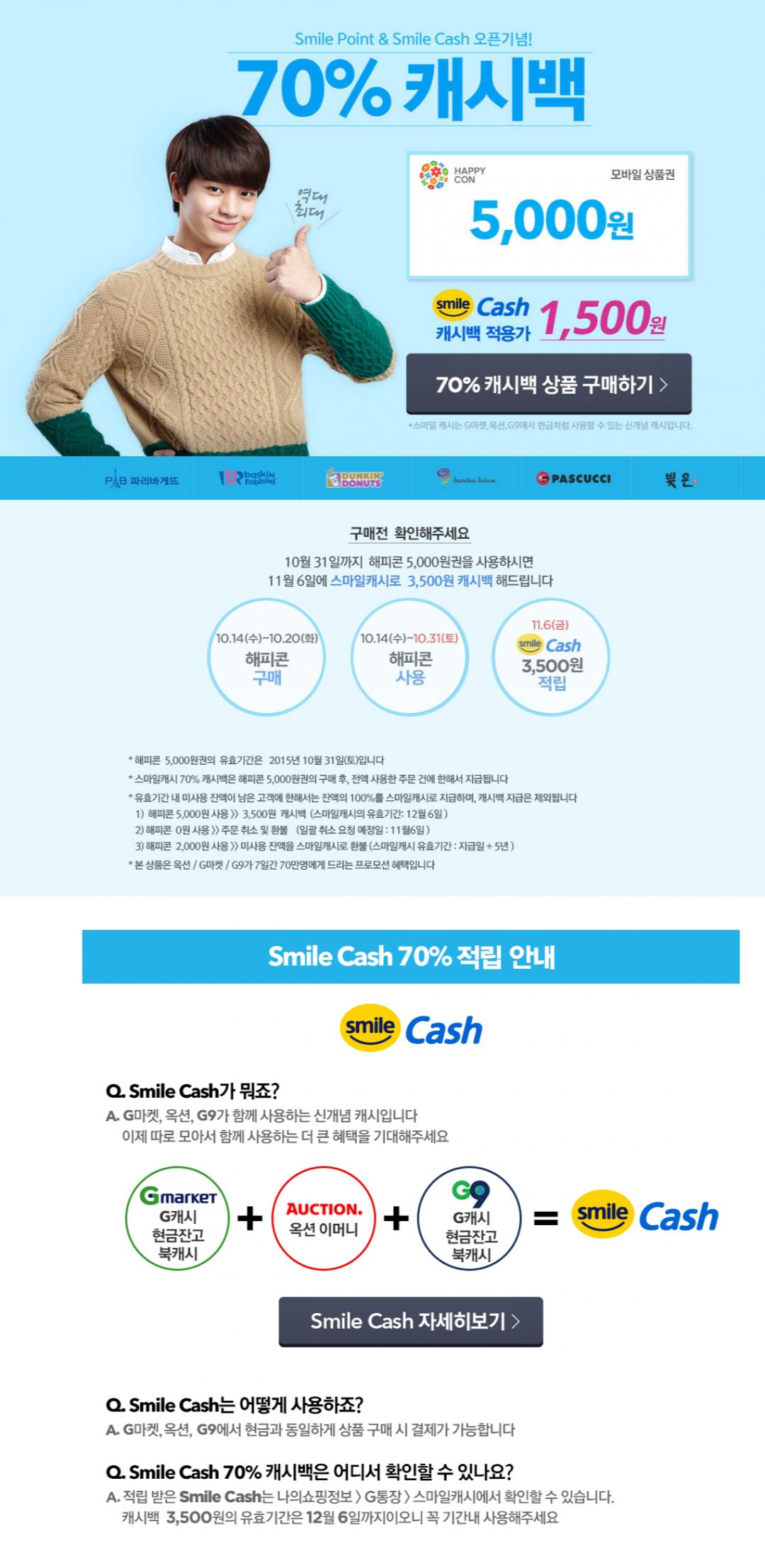 캐시백 높네요 70% 캐시백 해주면 해피콘은 1,500원에 구입하는셈 입니다.