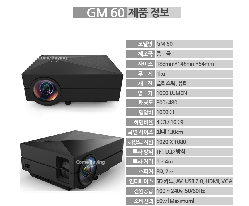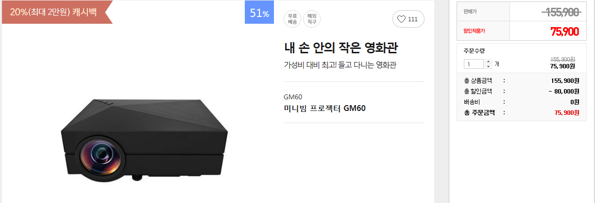 [디지털] [G9]미니빔 프로젝터 GM60[75,900/무료]캐쉬백가격 60,720원 > 국내핫딜