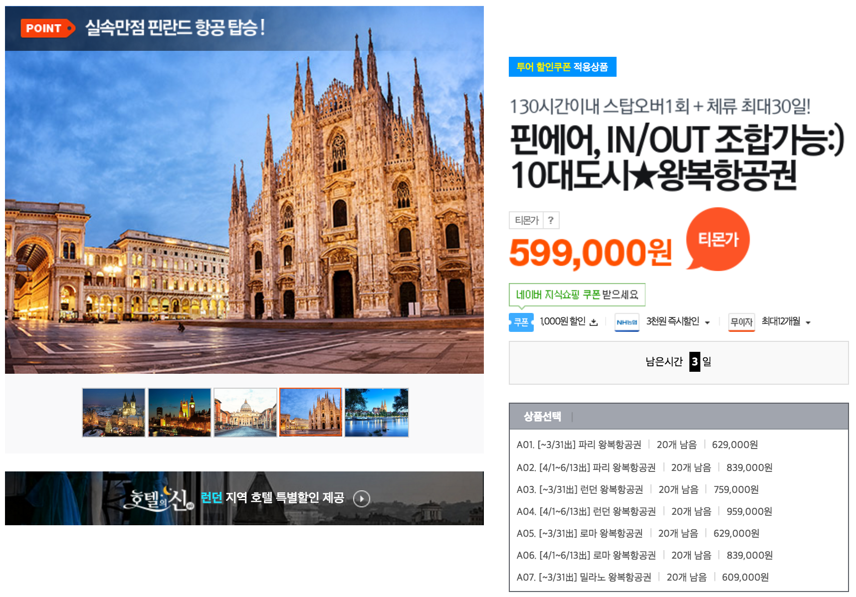 [티몬] [유럽] 10대도시 왕복항공권, 핀에어 (599,000~/무료) > 국내핫딜