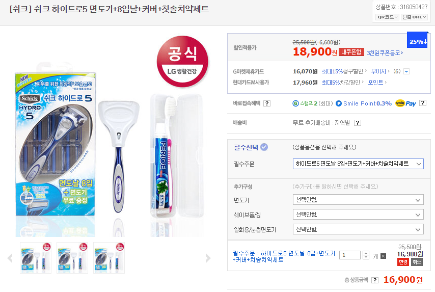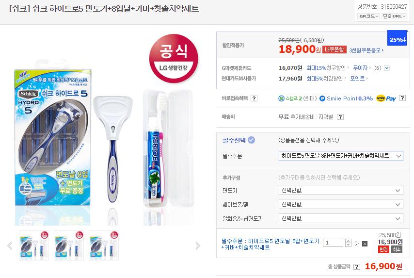 [G마켓]쉬크 하이드로5 면도기+8입날+커버+칫솔치약세트 (18,900/무료) > 국내핫딜