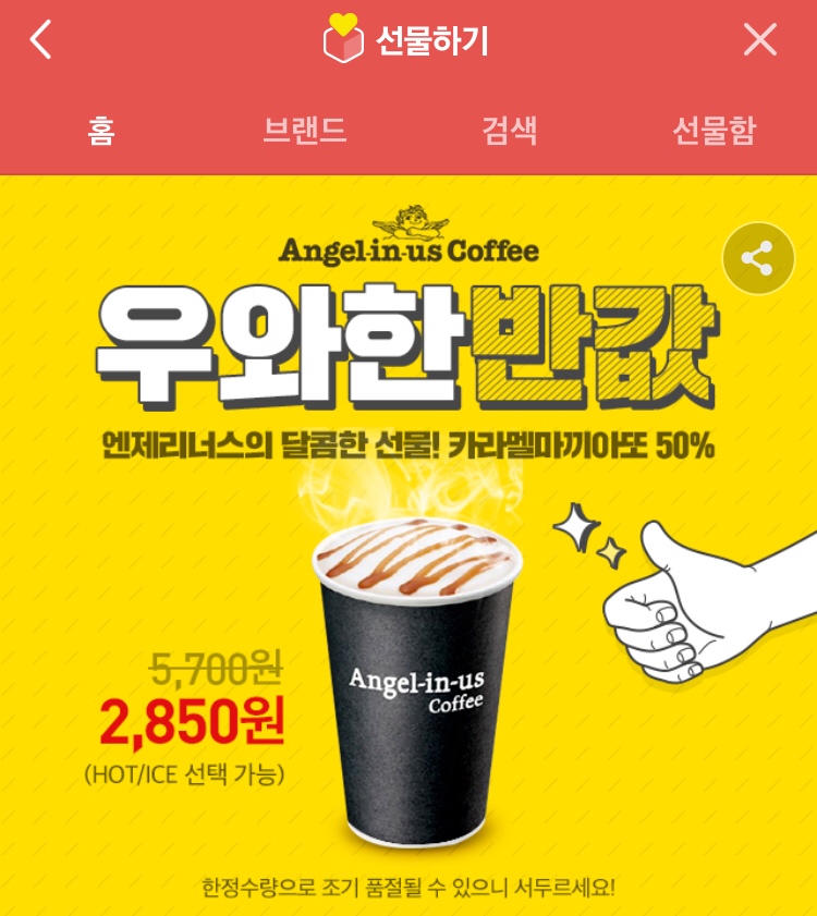 (품절)[카카오] 엔젤리너스 카라멜마끼아또(s) 50%할인 (2,850원/무료) > 국내핫딜