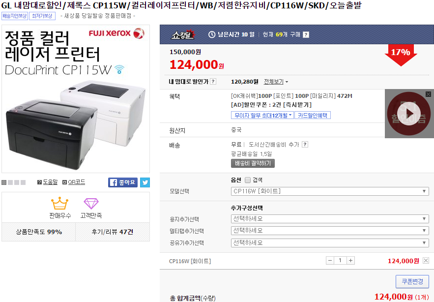 오늘 가격은 핫딜까진 아니고, 11번가 내맘대로할인+후지제록스 행사로 좀 괜찮은 딜이 된 수준이에요