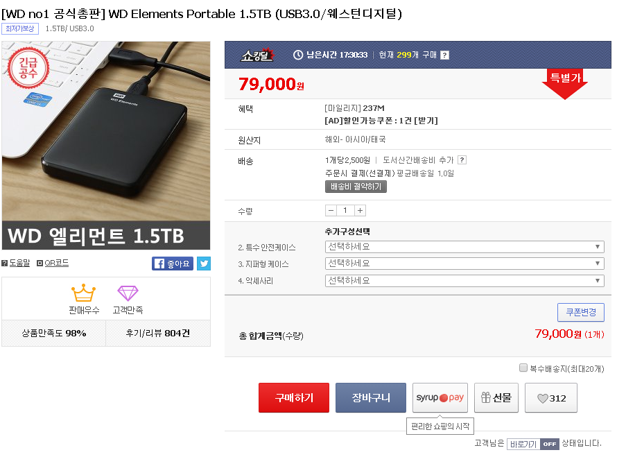 링크2에서 5만원이상구매시 만원할인쿠폰받고 구입하면 69000+2500원에 구입가능합니다.