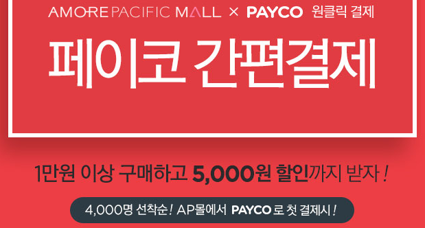 선착순 4,000명 아모레퍼시픽몰에서 페이코 첫 결제시 1만이상 / 5천원 할인쿠폰 줍니다.
