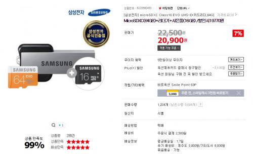 [옥션] MicroSDXC(64GB)+리더기+사은품(16GB) (20,900/2,500) 쿠폰 적용시 19,770원 > 국내핫딜