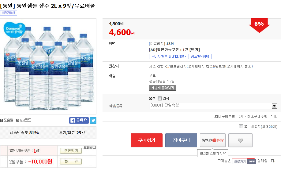 [11번가] 동원샘물 2L*9병 (4,600/무료)