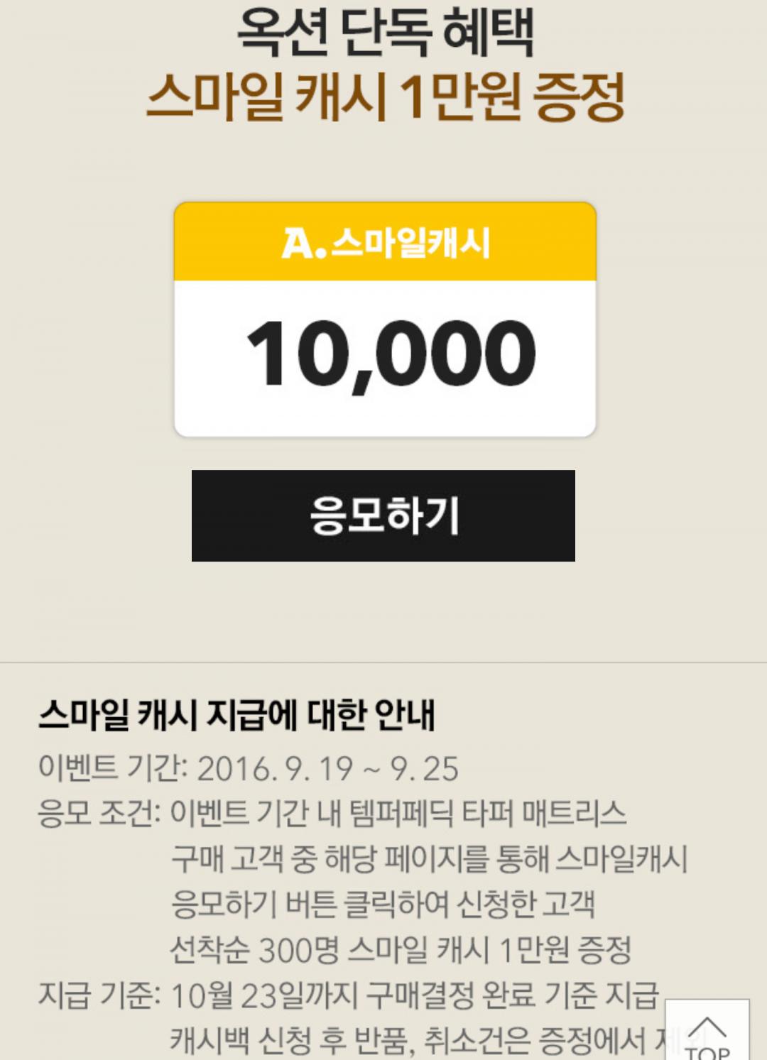 구입 후 두번째 링크에서 스마일캐시 만원도 응모하면 실체감가는 제가 구입한 퀸사이즈 기준으로 50만원(보다 조금 더 내려가더군요 (선착순 300명)
