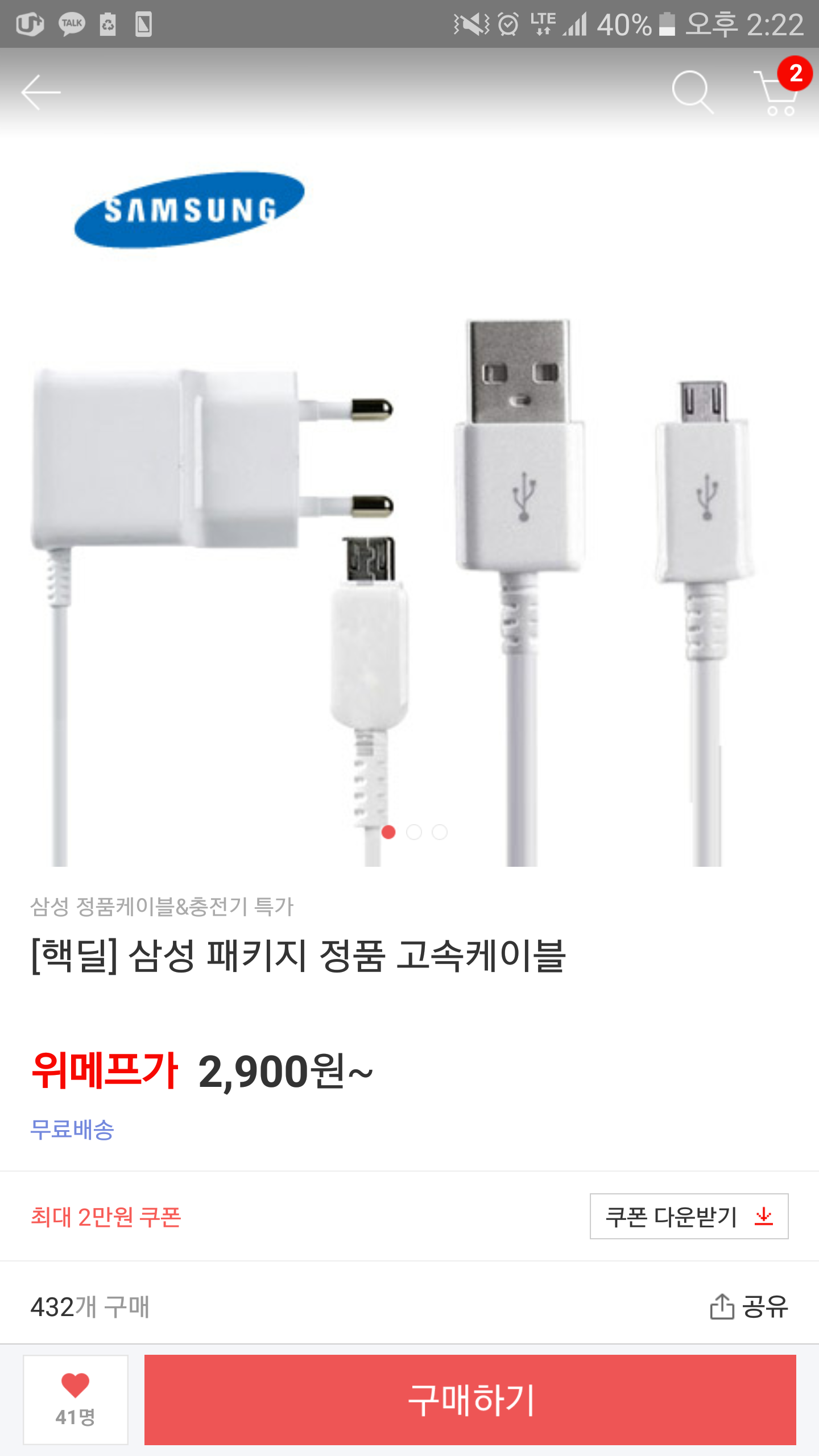 삼성 정품케이블이 2,900원에 무료배송이 올라왔네요.