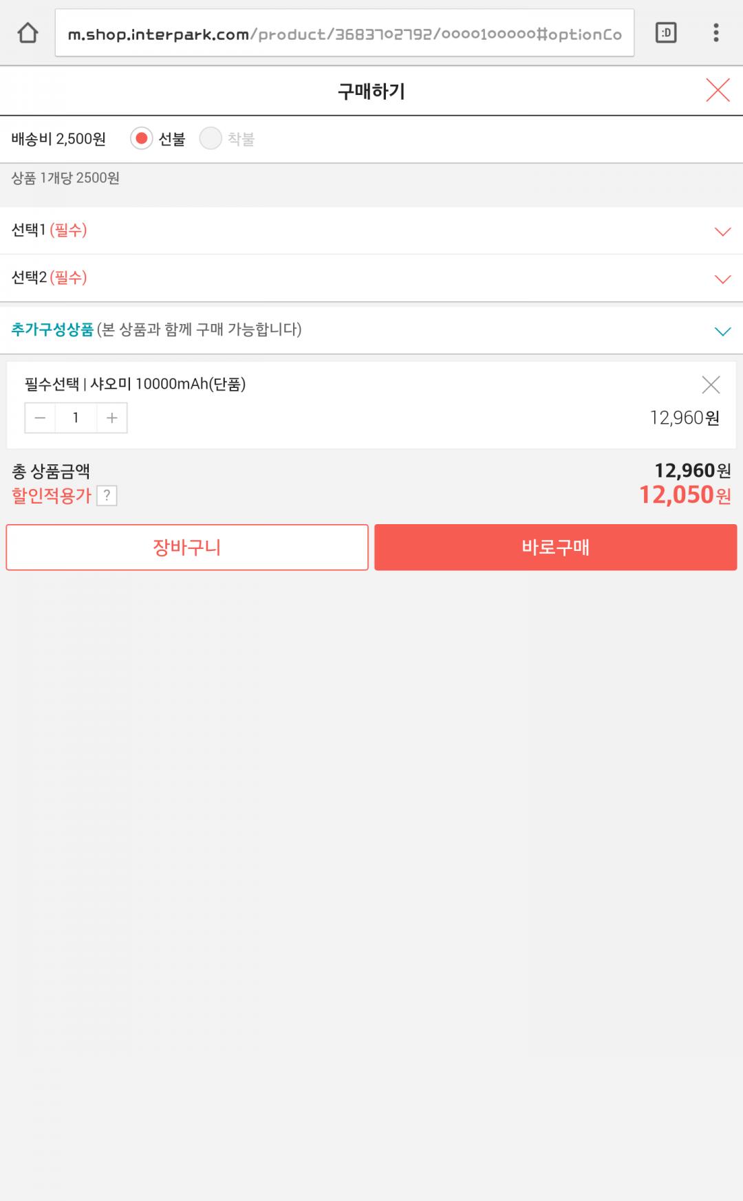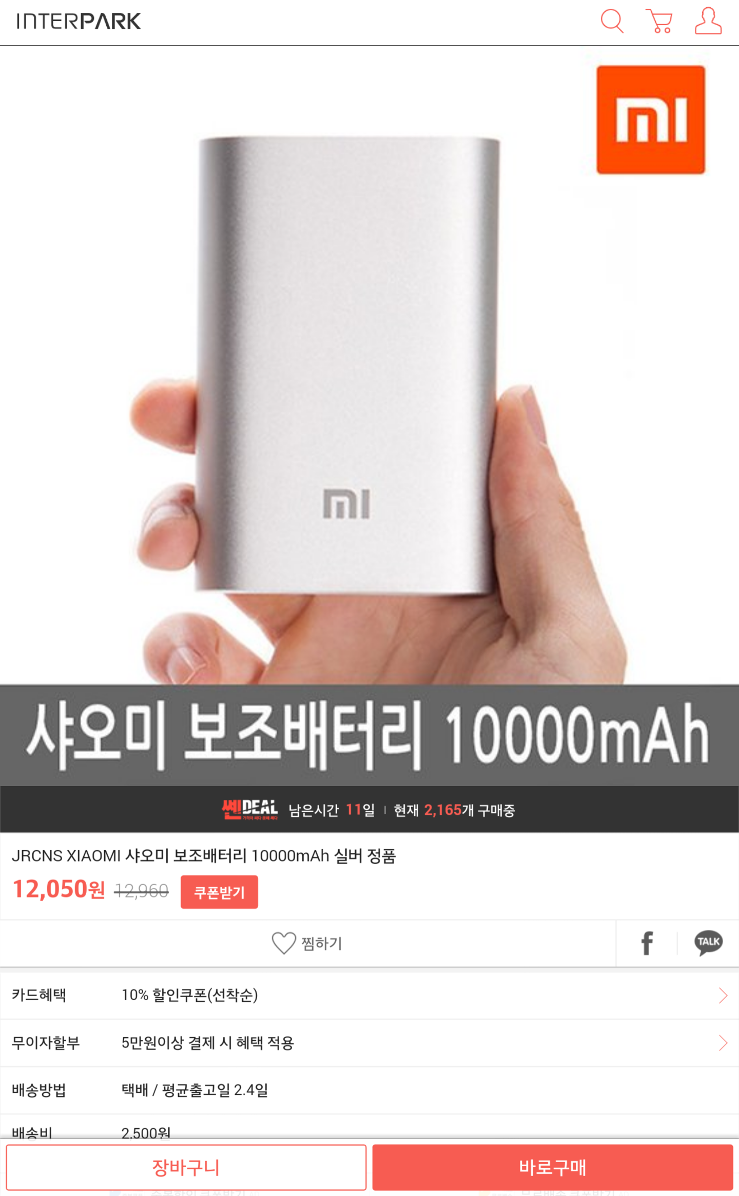 [인터파크] 샤오미 보조배터리 10,000mAh (12,050/개당 2,500)