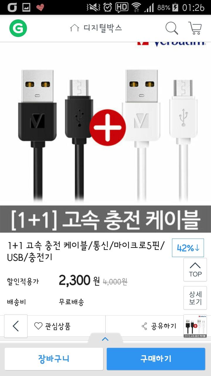 [G마켓] 버바팀 1+1 고속 충전 케이블 마이크로 5핀 (2,300/무료) > 국내핫딜