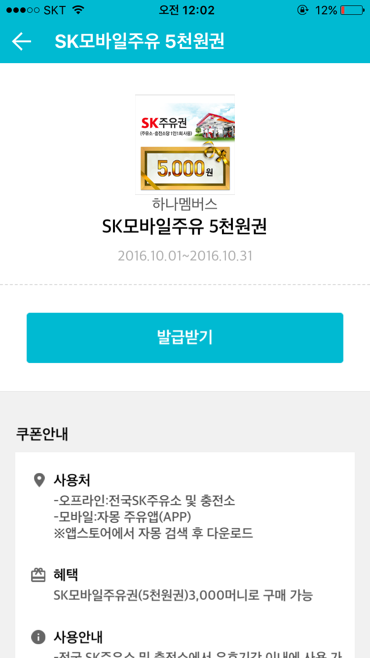 [하나멤버스어플] SK 모바일주유 5천원권 (3000/0)