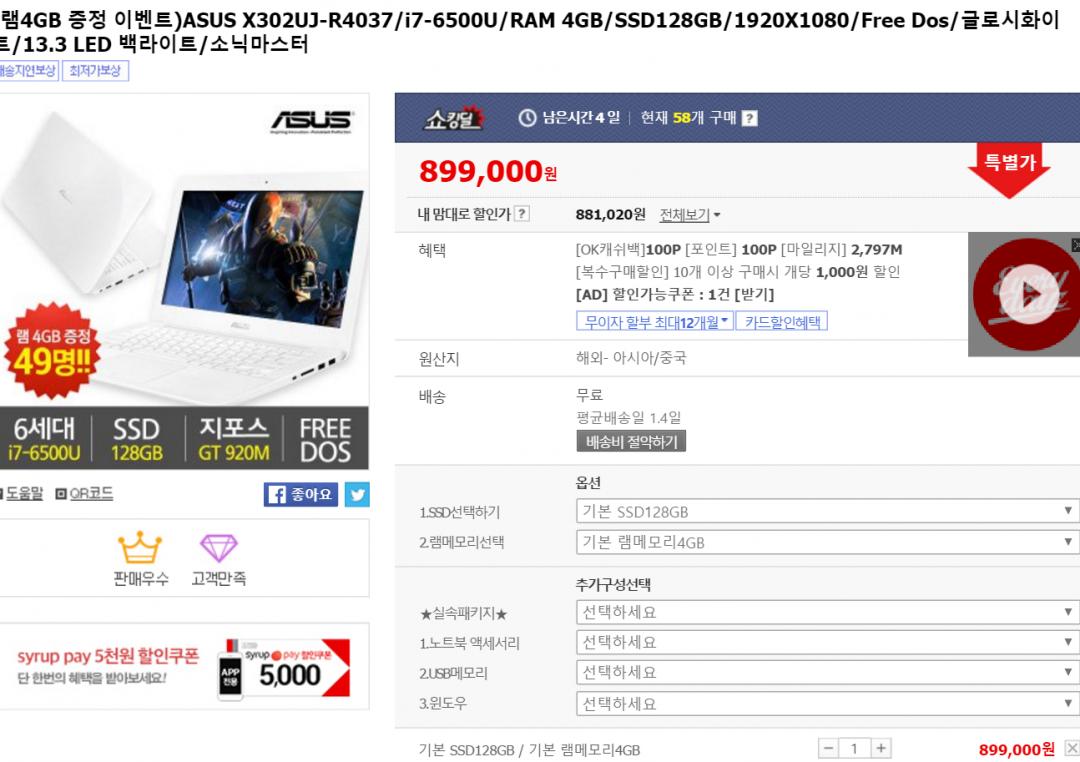 [11번가] ASUS X302UJ i7-6500u, gtx920m 노트북 > 국내핫딜