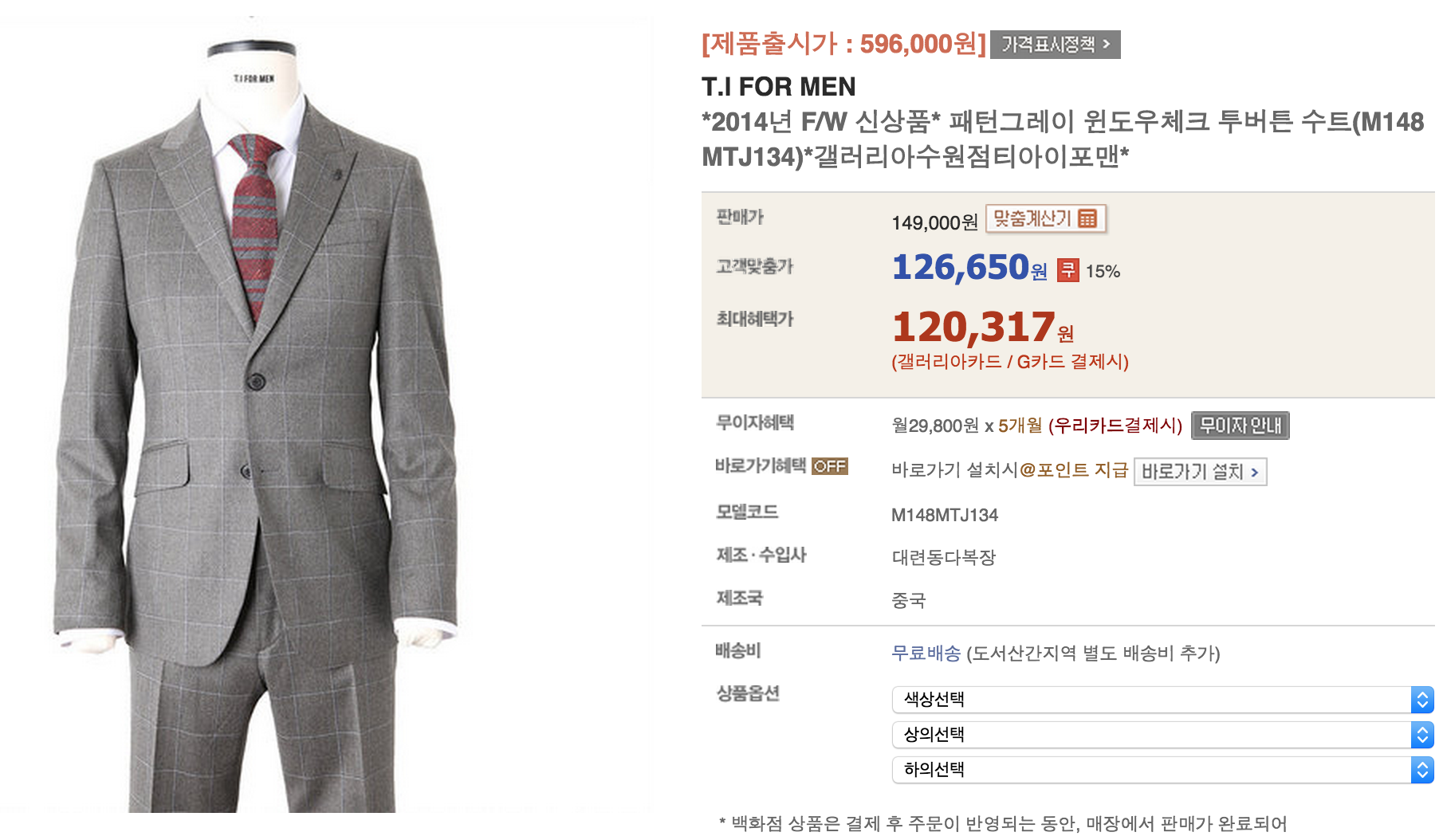 피크 라펠에 윈도우페인 체크라 취향은 타겠지만 티아이 이 정도면 가격 좋네요. 골든 사이즈도 전부 살아있구요 |