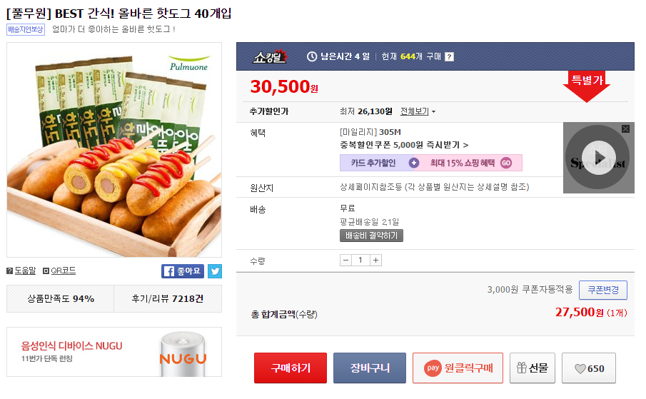 [11번가] 풀무원 올바른핫도그 40개입 (30,500->쿠폰적용시 27,500/무료)
