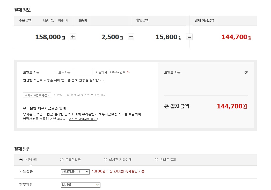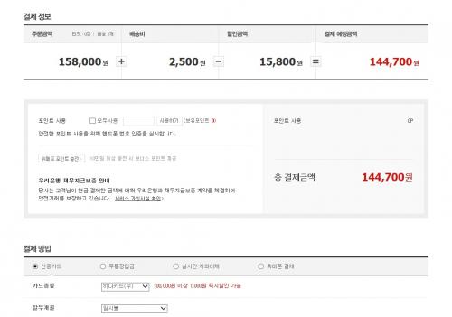 158,000 - 10%(핵딜쿠폰) - 7000(BC카드/하나카드 즉시할인)