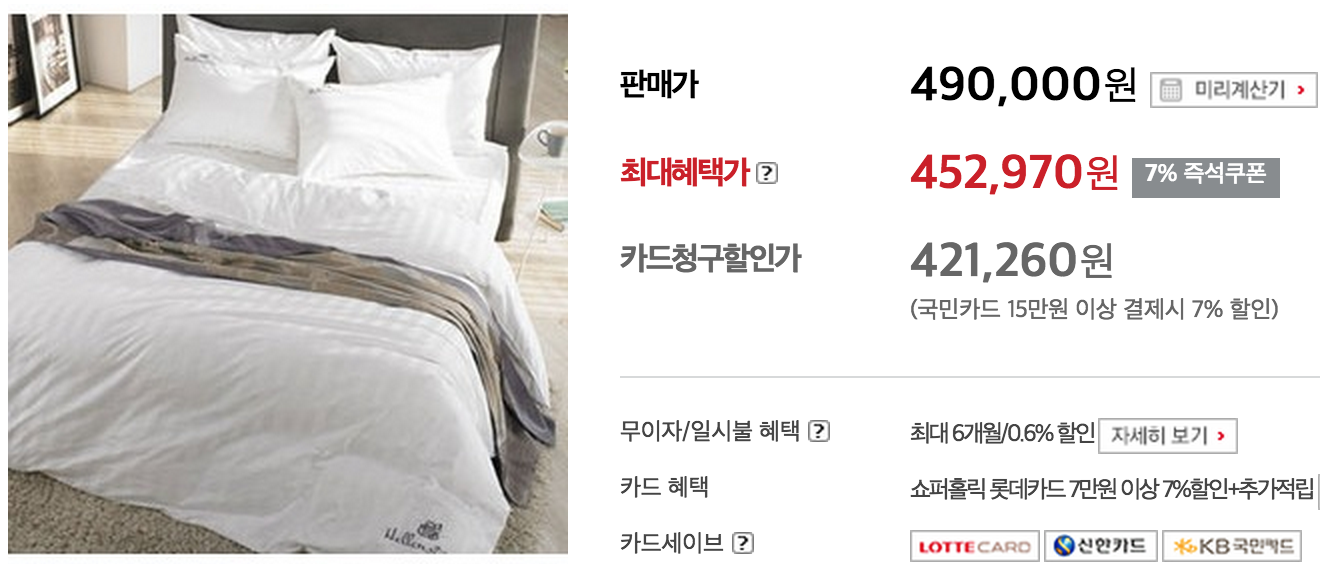 롯데호텔, 신라호텔 등에 납품되고 있는 최고급 이불이라고 해요..