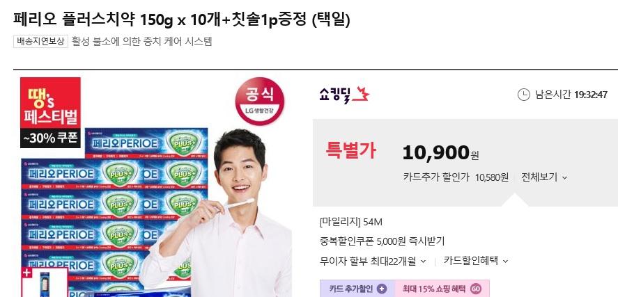 [11번가] 페리오 플러스치약 150g x 10개+칫솔1p증정 (10,900/ 무료) > 국내핫딜