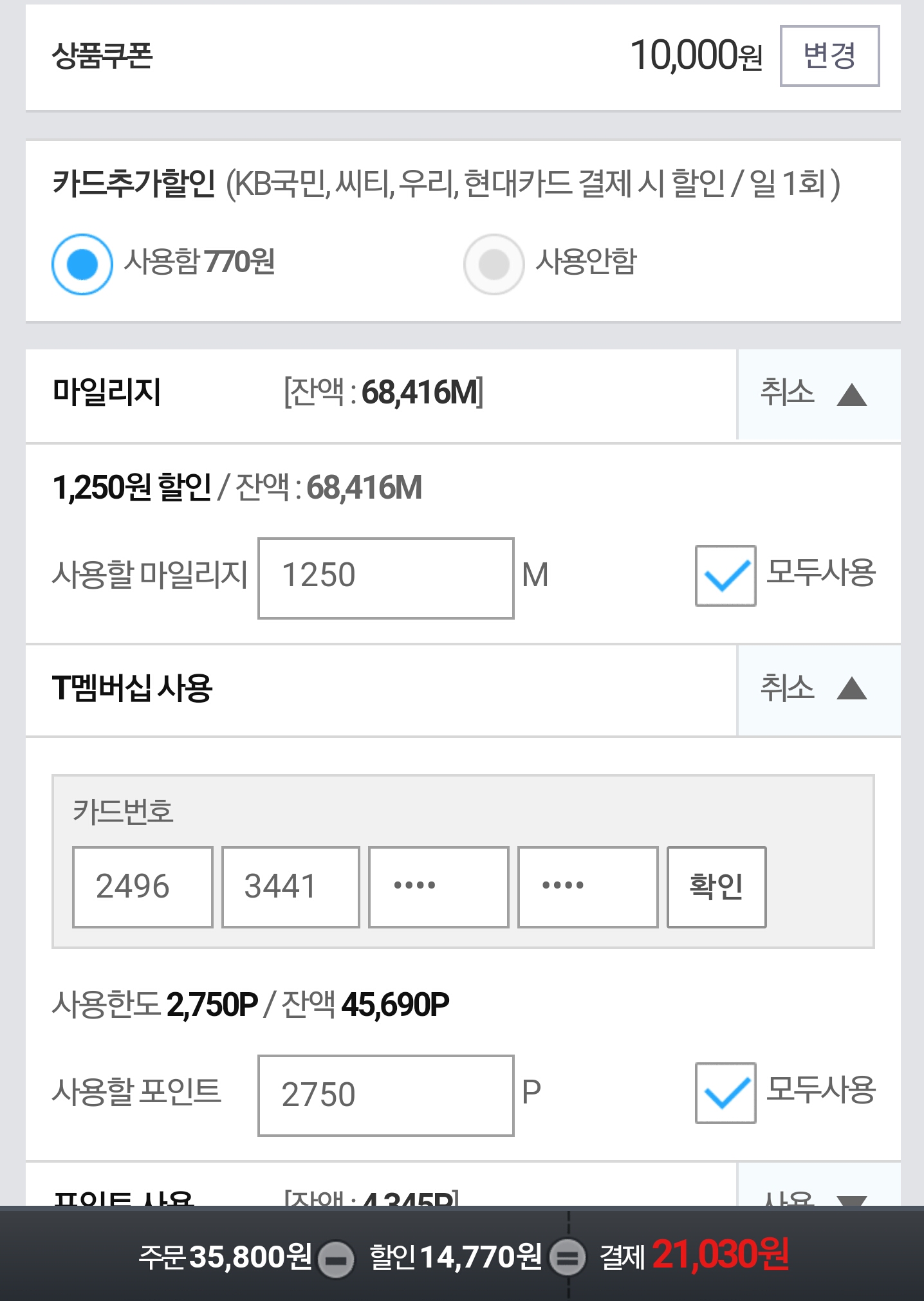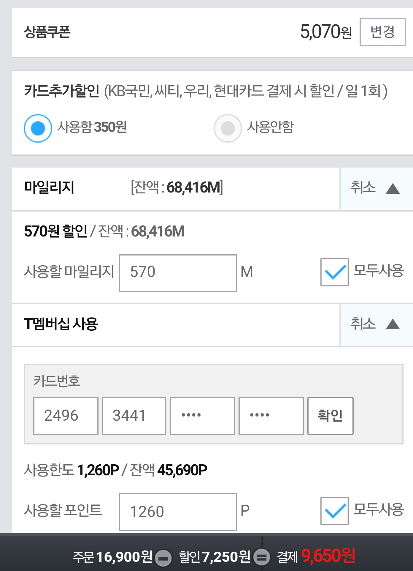 카드할인 + t멤버십 할인 + 마일리지할인 까지 받아서 9500원인거죠? | ||