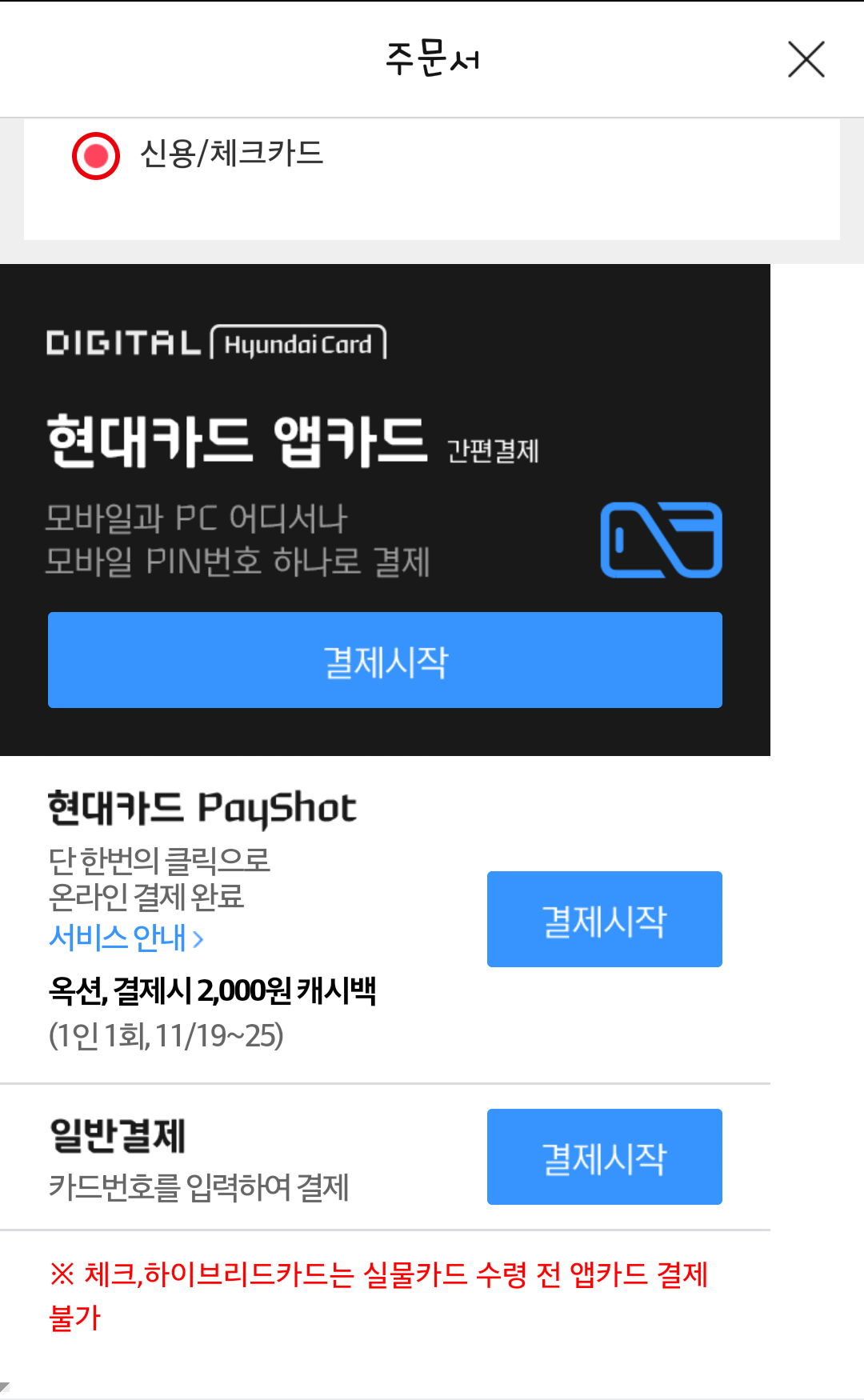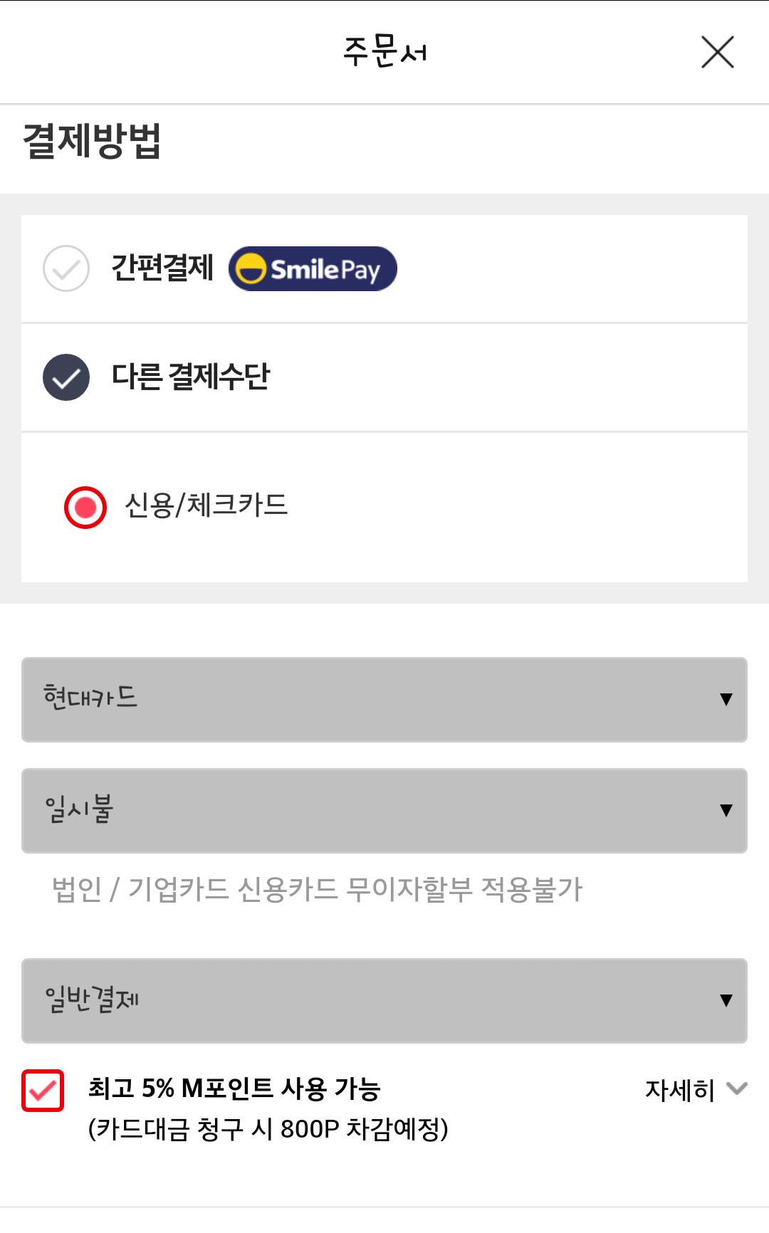 4. 편하신 방법으로 결제 진행하시면 됩니다. 저는 현대 M포인트 5%를 사용하기 위해 현대 M3카드를 사용했습니다. 여기서 페이샷을 이용하면 2,000원 환급해주기 때문에 더더욱 현대카드를 사용했습니다.