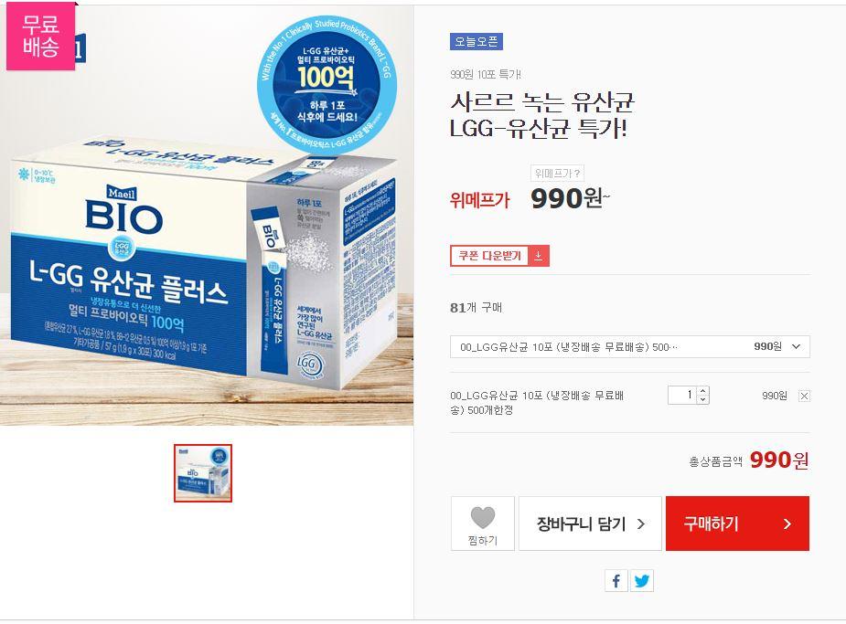 [위메프] LGG-유산균 10포 (990/무료) > 국내핫딜