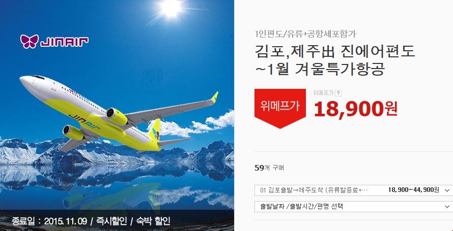 [위메프] 김포,제주 진에어 편도 (18,900원~/0)