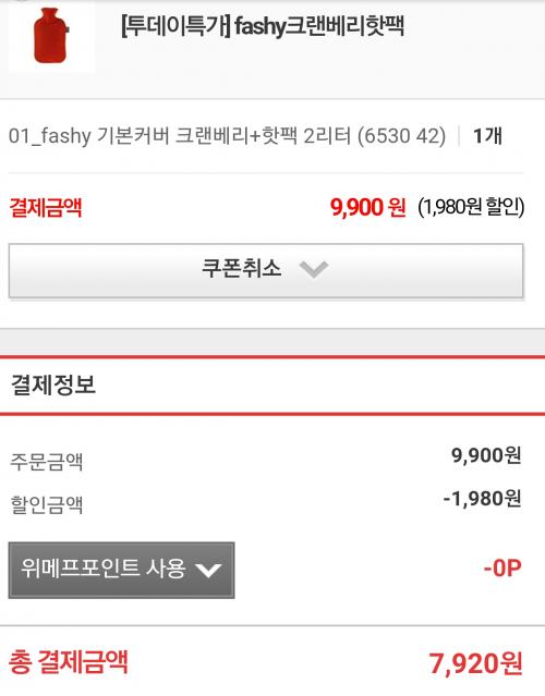[위메프] 파쉬 2L핫팩+크렌베리커버(9,900/0)쿠폰적용시 7,920원 > 국내핫딜