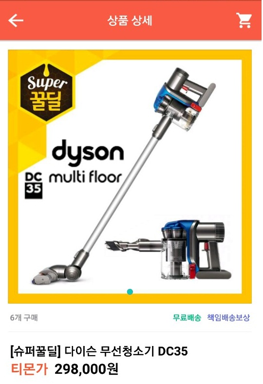 [티몬] 슈퍼꿀딜 다이슨 무선청소기 DC35 (298,000/무료)