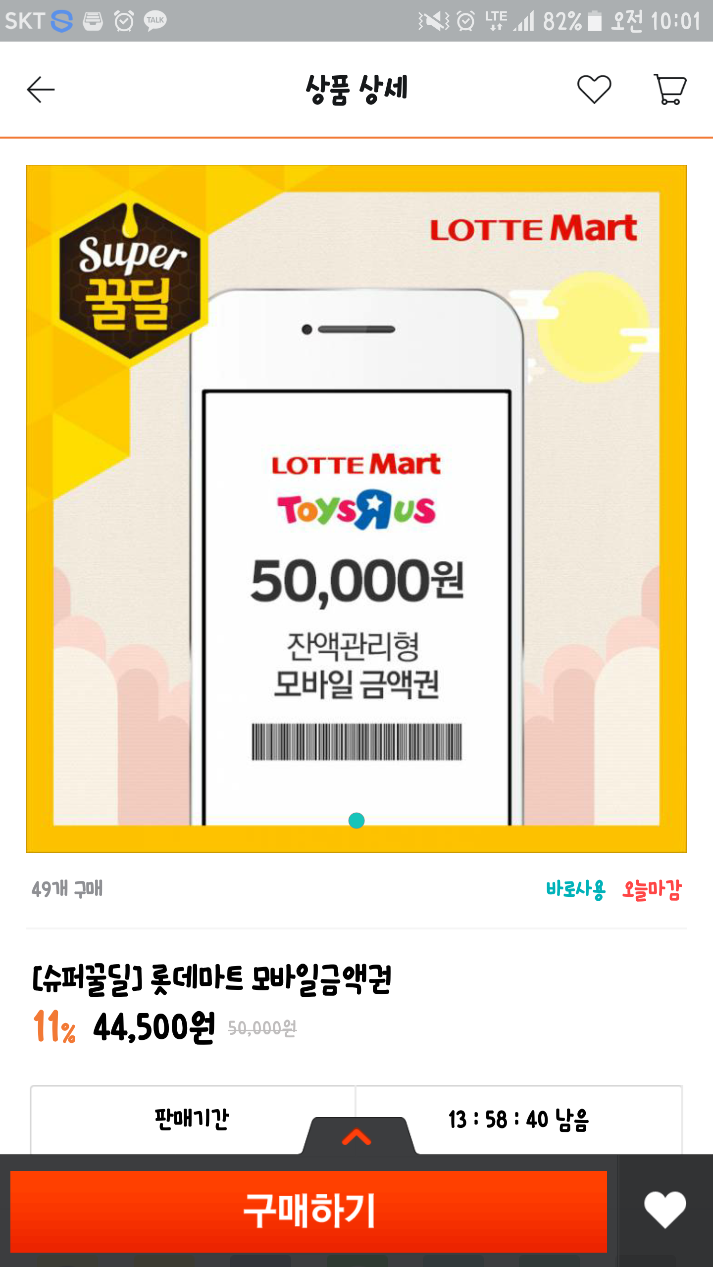 [티몬] 롯데마트 5만 금액권 (44,500/무료)