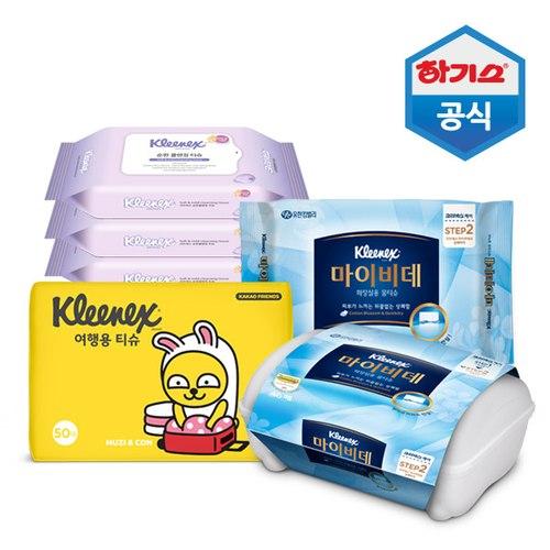 유한킴벌리 크리넥스 카카오티슈50매x1+마이비데30매(용기)+순한클랜징티슈2매x3 구성입니다.