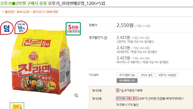 5개 팩에 1개씩 덤 + 2팩 이상 10프로 할인 + 2만원이상 구매시 5000원 기프트카드 증정 행사중입니다.