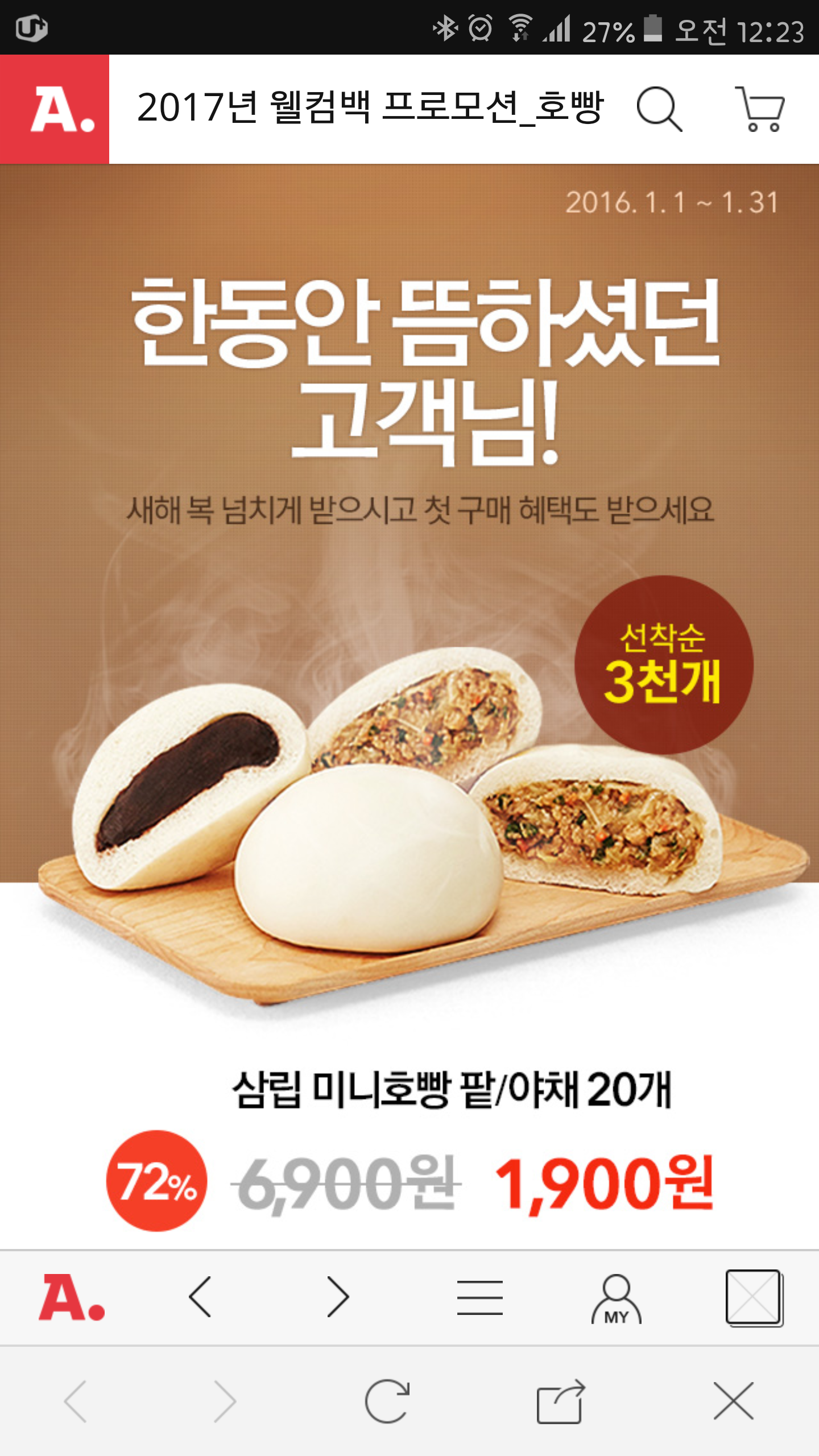 옥션에서 2016년 1월부터 구매내역 없는 회원들한테 5천원 쿠폰주고 그거 사용하면 삼림호빵 1,900원 무배네요ㅋㅋ크기는 크지는 않은거같지만 가성비 ㅎㄷㄷ 저는 뭐든 가성비만 좋으면..ㅋㅋ