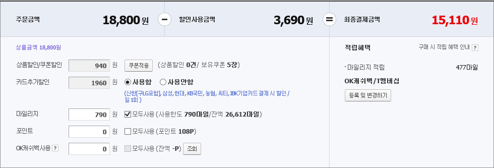 마트식품 쿠폰 + 카드할인+ 마일리지 할인까지 하면 최종가격 15,110원 되겠습니다.