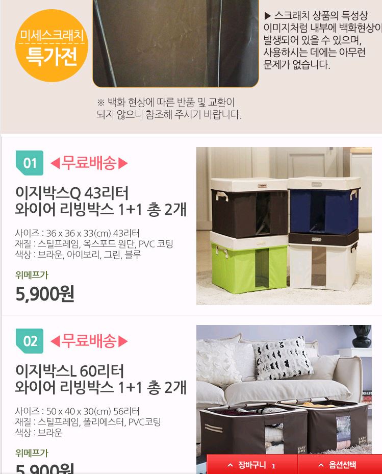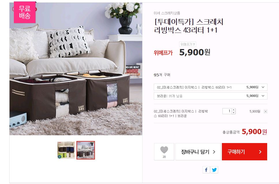 [위메프] 스크레치 리빙박스 43리터 1+1 (5,900/무료)