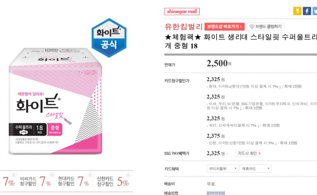 [SSG] 화이트 생리대 스타일핏 수퍼울트라 날개 중형 18개입(2,500/무료) > 국내핫딜
